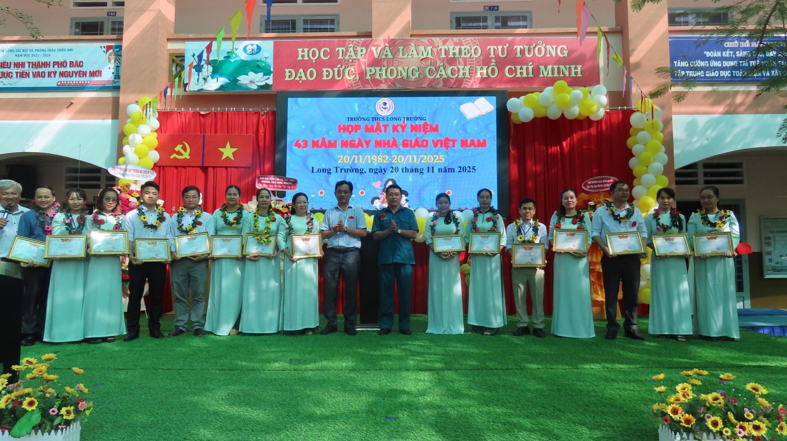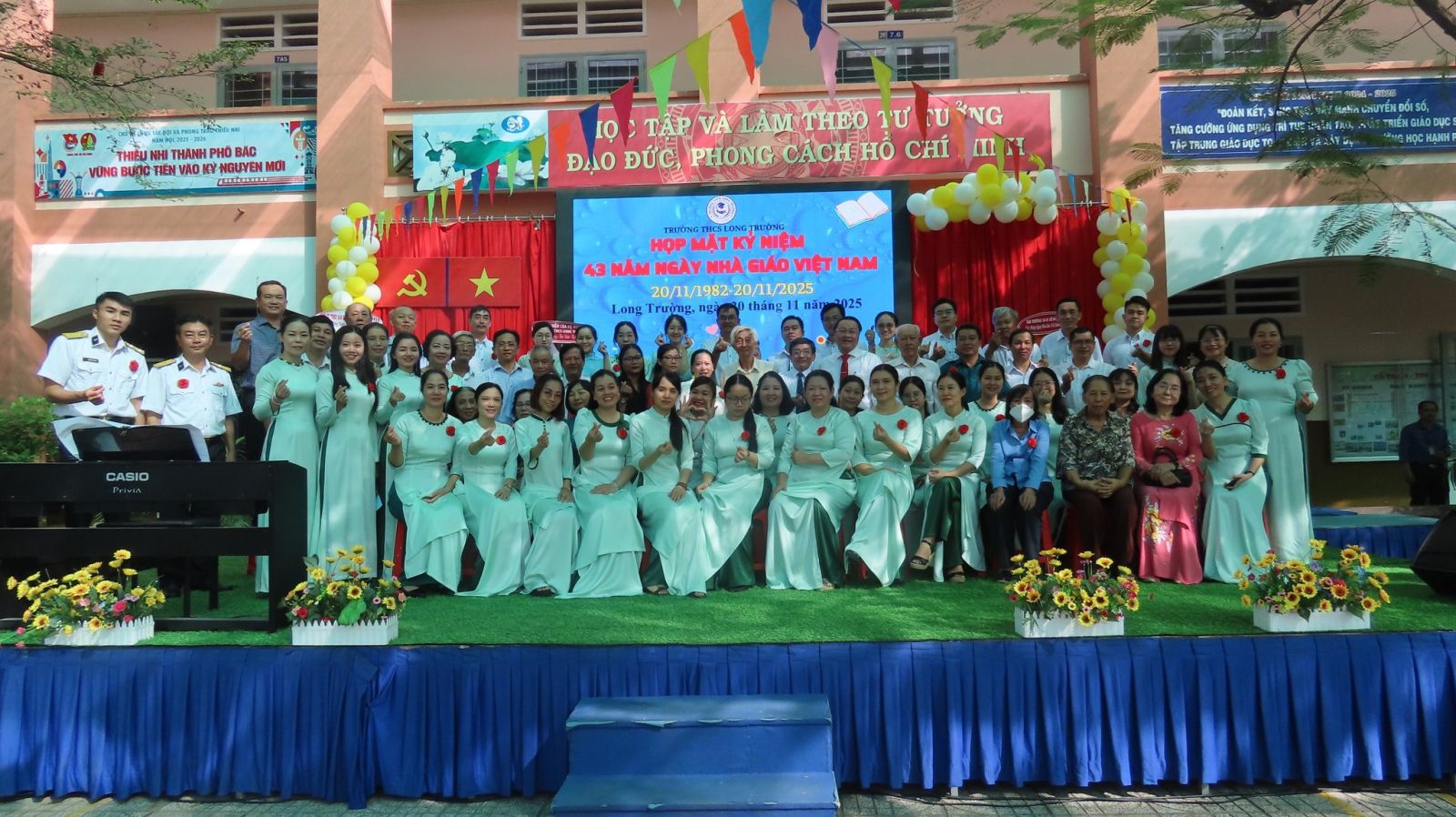Trường THCS Long Trường long trọng tổ chức kỷ niệm 43 năm Ngày Nhà giáo Việt Nam 20/11, với sự tham dự của lãnh đạo địa phương, thầy cô giáo, cựu học sinh nhiều thế hệ. Buổi họp mặt không chỉ là dịp tri ân thầy cô mà còn lan tỏa tinh thần “tôn sư trọng đạo”, kết nối các thế hệ học sinh và trao học bổng ý nghĩa cho học sinh vượt khó, hiếu học.